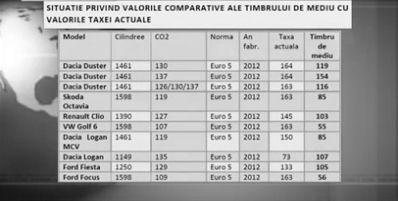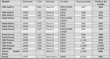 Astfel, pentru o maşină Dacia Duster Euro 5 de 1461 cmc, fabricată în 2012, taxa de plătit va scădea de la 164 euro la 119 euro, în timp ce pentru un Volkswagen Golf 1390 cmc Euro 4, fabricată în intervalul 2001-2003, taxa va creşte de la 147 euro la 264 euro.