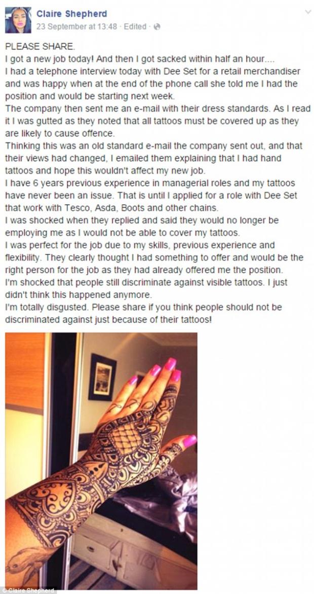 Însă lucrurile au luat o întorsătură neaşteptată. După numai 30 de minute, Claire a fost concediată din cauza unui tatuaj pe care aceasta îl are pe mâna stângă.