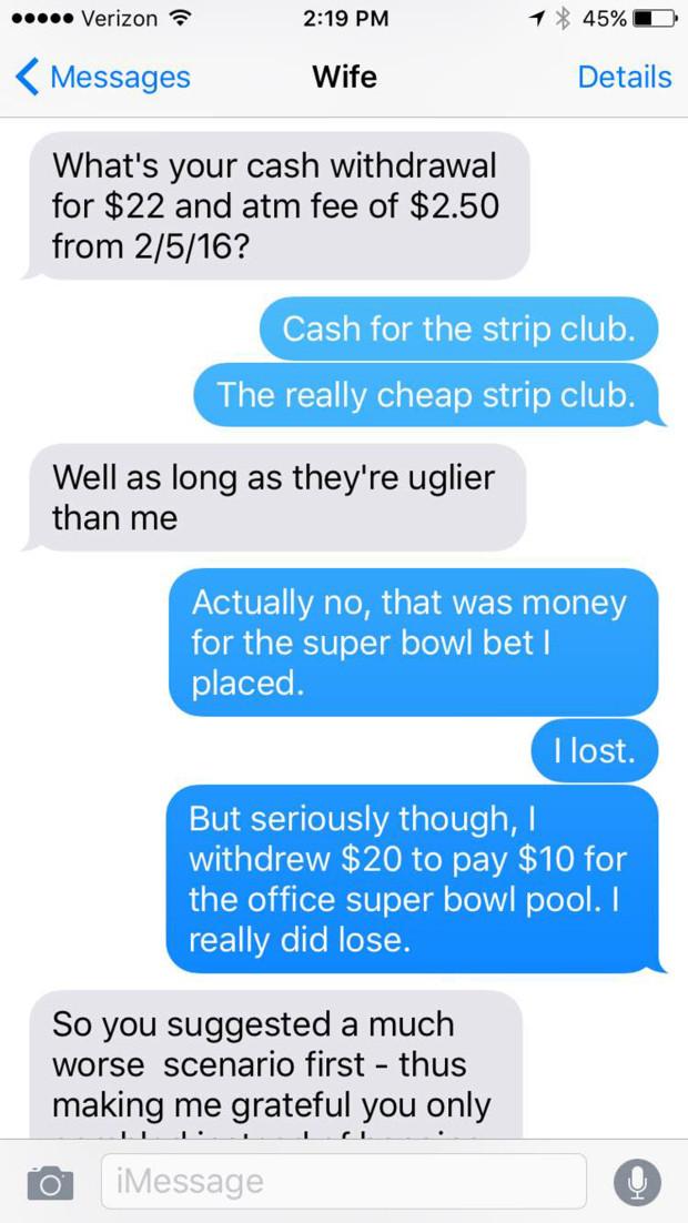 Gândindu-se că un răspuns sincer ar putea să o supere pe femeie, Hank a răspuns: „Am fost la un club de striptease, d-ăla ieftin rău”.