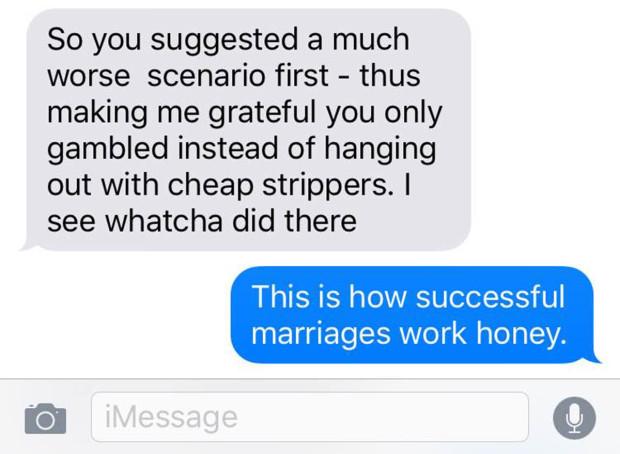 ”Da, draga mea. Așa funcționează căsniciile fericite”, a glumit bărbatul.
