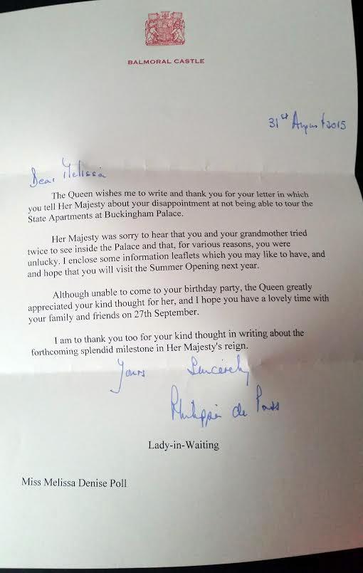 Potrivit mirror.co.uk, Melissa Poll i-a scris reginei o scrisorică în care i s-a plâns că a încercat să intre în Palatul Buckingham, împreună cu sora ei mai mică, însă accesul le-a fost restricţionat, dar şi să o invite la aniversarea zilei ei de naştere, pe 27 septembrie.