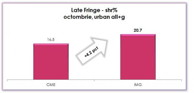 În intervalul orar 23,00 - 02,00, Antenele conduc clasamentul la o diferență semnificativă de 4,2 puncte de market share. Un show pacatos, prezentat de Dan Capatos, la Antena 1, dar și În gura presei cu Mircea Badea, la Antena 3, reprezintă punctele de atracție ale orelor târzii pentru telespectatori.