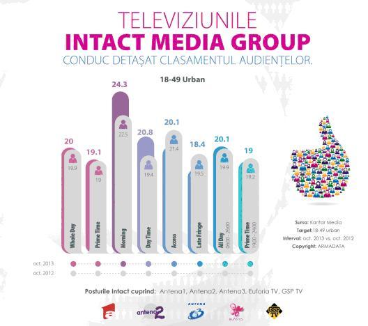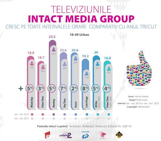 De asemenea, televiziunile Intact înregistrează o creștere pe toate intervalele orare în ianuarie – octombrie 2013, comparativ cu aceeași perioadă a anului trecut.