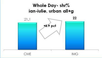 De asemenea, televiziunile IMG înregistrează creșteri de audiență pe toate intervalele orare în ianuarie - iulie 2013, comparativ cu aceleași luni ale anului 2012, pe targetul comercial 18-49.
