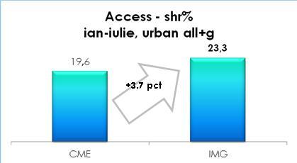 Acces este un segment orar foarte important, unde televiziunile Intact Media Group își consolidează poziția de lider. Cota de piață înregistrată între orele 16:00 19:00 este de 23,3% cu 3,7 puncte mai mult decât CME. În acest interval orar sunt transmise Acces Direct, Observatorul orei 16:00, Știrile Antenei 3 sau Esențial. Comparativ cu anul trecut, pe target-ul All Urban, market share-ul este mai mare cu 6%.