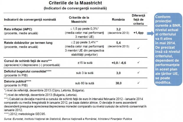 Tratatul de la Maastricht ce urmareste convergenta nominala, conditioneaza intrarea in zona euro de o rata a inflatiei care sa nu depaseasca cu mai mult de 1,5% inflatia medie a celor mai performante trei state din UE, iar in cazul Romaniei inflatia medie din ultimele 12 a ajuns la 1,5% in iunie.