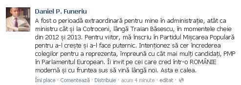 Pentru viitor, mă înscriu în Partidul Mişcarea Populară pentru a-l creşte şi a-l face puternic. Intenţionez să cer încrederea colegilor pentru a reprezenta, împreună cu cât mai mulţi candidaţi, PMP în Parlamentul European. Îi invit pe cei care cred într-o ROMÂNIE modernă şi cu fruntea sus să vină lângă noi. Asta e calea", a scris Funeriu, marţi, pe Facebook.