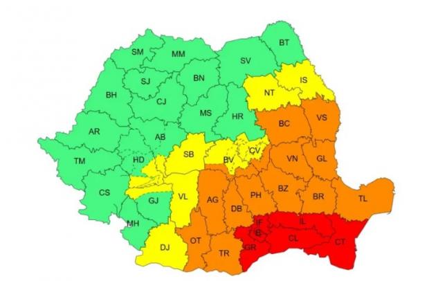 Codul roșu de ploi torențiale vizează județele Constanța, Călărași, Ialomița, Giurgiu, Ilfov și Municipiul București. În aceste zone cantitățile de apă vor ajunge la 80-100 litri pe metru pătrat și izolat chiar 120-140 litri pe metru pătrat, cu posibilitatea apariției descărcărilor electrice.