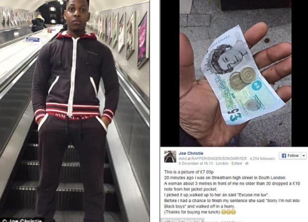 Joe Christie, un rapper de 23 de ani, se plimba pe străzile din Londra când a văzut o femeie de 30 de ani la aproximativ trei metri în fața lui. Femeii i-a căzut din buzunar o bancnota de 10 lire, iar tânărul s-a aplecat, a ridicat banii și a vrut să ii înapoieze femeii. Atunci a primit un raspuns neasteptat.