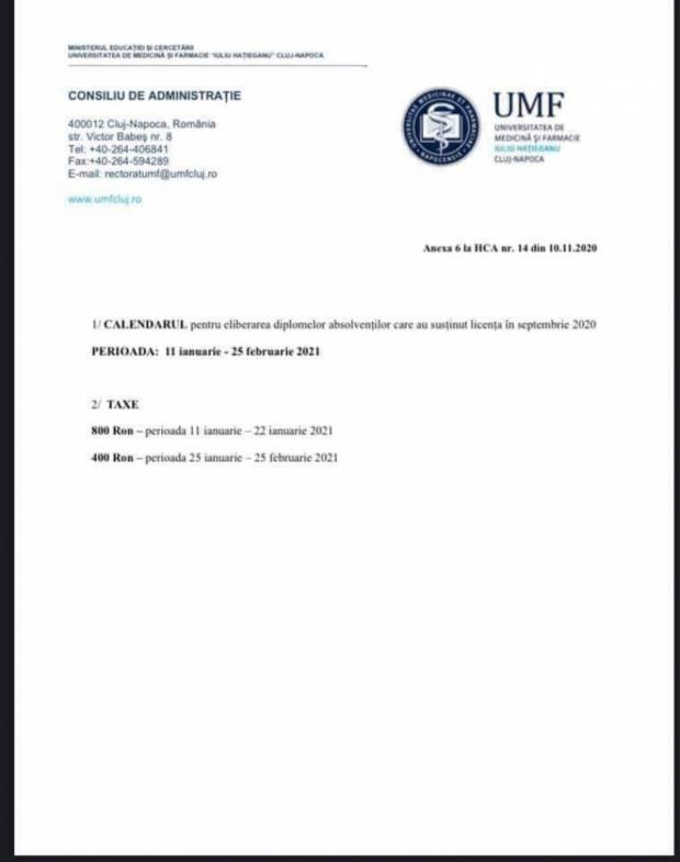 Dezvăluirea a fost făcută de un student al Universităţii Bucureşti, care a contestat în instanţă mărirea taxelor de studiu în plină criză sanitară. O taxă asemnănătoare pentru eliberarea diplomelor de studii există şi la Universitatea Bucureşti, însă nu de 800 de lei, ci de 200 de lei, spune tânarul într-o postare pe reţelele de socializare.