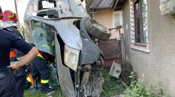 Accident spectaculos în Bistrița-Năsăud. O mașină a ajuns cu roțile pe o casă, sub fereastra dormitorului