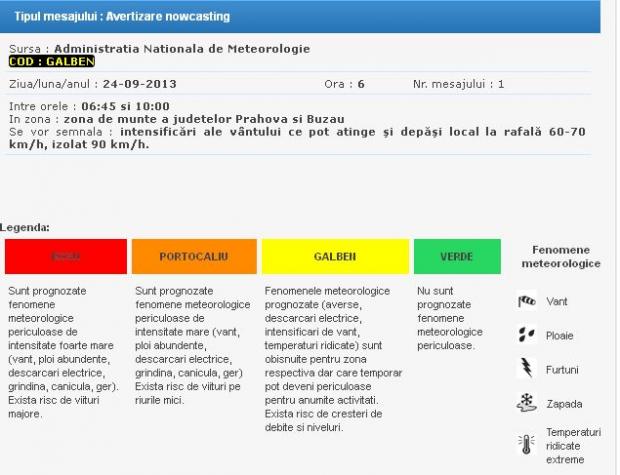 O avertizare nowcasting a fost transmisă în această dimineaţă de ANM, fiind vizate mai multe zone din ţară. Meteorologii au emis cod galben de vânt puternic pentru zonele montane ale judeţelor Prahova şi Buzău, aici rafalele putând atinge viteze şi de 90 km/h.