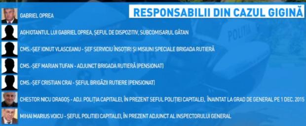 „Am dat o declaraţie în legătură cu tragicul accident în care a murit poliţistul Gigină. Am spus adevărul. Adevărul este că sunt nevinovat, că eram în timpul serviciului. Din păcate, poliţistul a căzut în cele trei gropi, care nu erau semnalizate corect, nu erau semaforizate. Nu m-au trimis în judecată. M-am prezentat la Parchet şi am dat o declaraţie. E prima oară când am făcut declaraţii”, a spus Oprea.