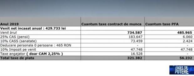 Un regim de impozitare există pentru salarii și alt regim de impozitare există pentru PFA. ”E foarte limpede din textele de lege care există că în acest tip de relație faptul că desfășori o activitate de management este o activitate de mandat, are valoarea unei activități care ar trebuie să genereze un venit salarial. Dacă am avea o activitate de tipul acesta taxele și impozitele pe care ar trebui să le plătești în comparație cu taxele pentru PFA sunt diferite”, a explicat Adrian Ursu. 321.382 de lei (cuantum taxe contract de muncă) în loc de 56.232 de lei (cuantum taxe PFA)!