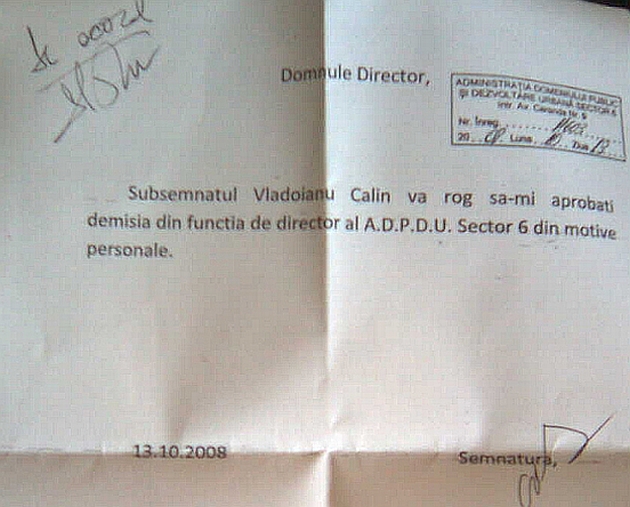 Speriat probabil de amploarea protestelor, luni, directorul executiv al ADP, Călin Vlădoianu, sector 6 a demisionat din funcţie "din motive personale". (vezi foto).