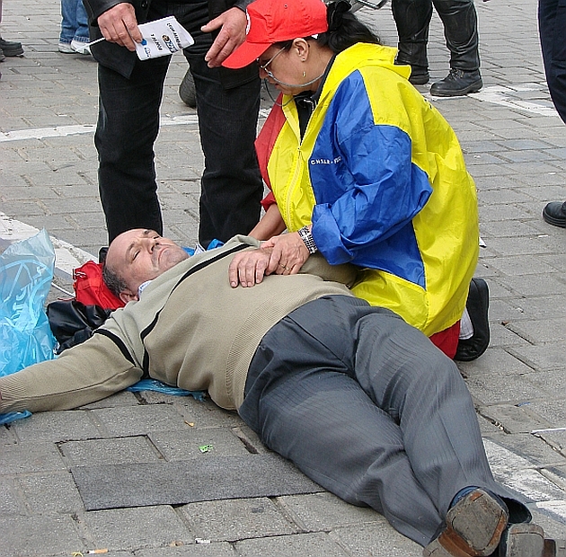 În spatele lor rămân câteva persoane care aranjează scena pentru discursurile de la ora 12:30. Mai rămân câteva gunoaie pe jos şi un bătrânel căzut printre ele. I s-a făcut rău, deşi spune că nu a avut niciodată probleme. Stă întins şi respiră apăsat. Oamenii s-au strâns în jurul lui şi sună la salvare. Poliţiştii prezenţi în Piaţa Constituţiei ?dau şi ei prin staţie?. Trec cinci minute, trec zece... nici urmă de salvare. În sfârşit se aude o sirenă. O ambulanţă îşi face apariţia, opreşte la insistenţele jandarmilor, dar apoi îşi vede în continuare de drum. Avea o altă urgenţă. Mai trec alte zece minute, deşi cârcotaşii spun că a trecut o oră, şi vine şi salvarea bărbatului. Totul este bine acum.