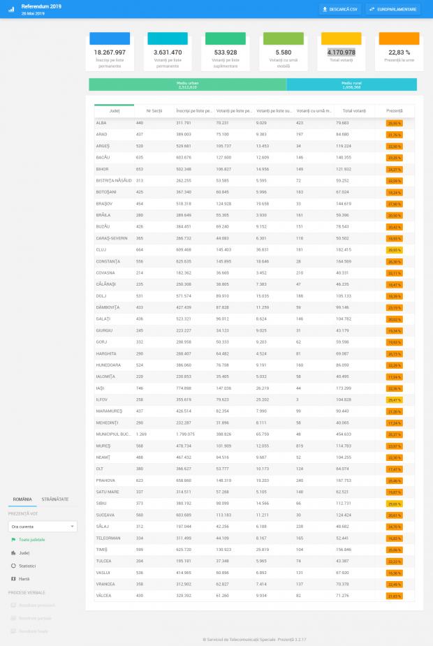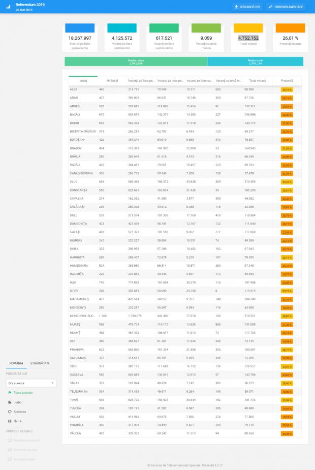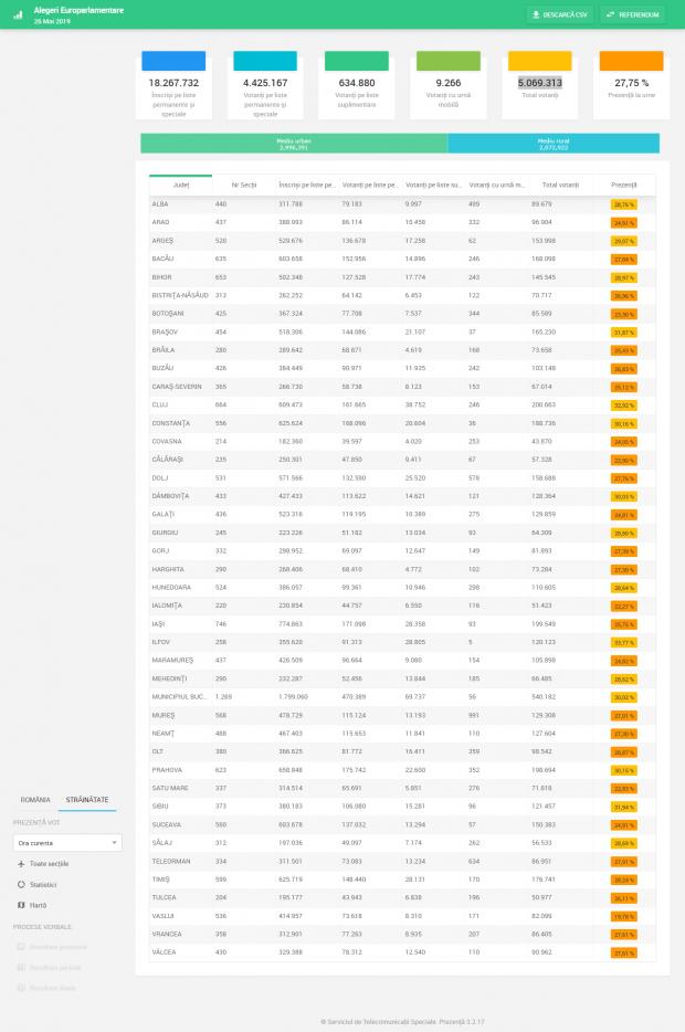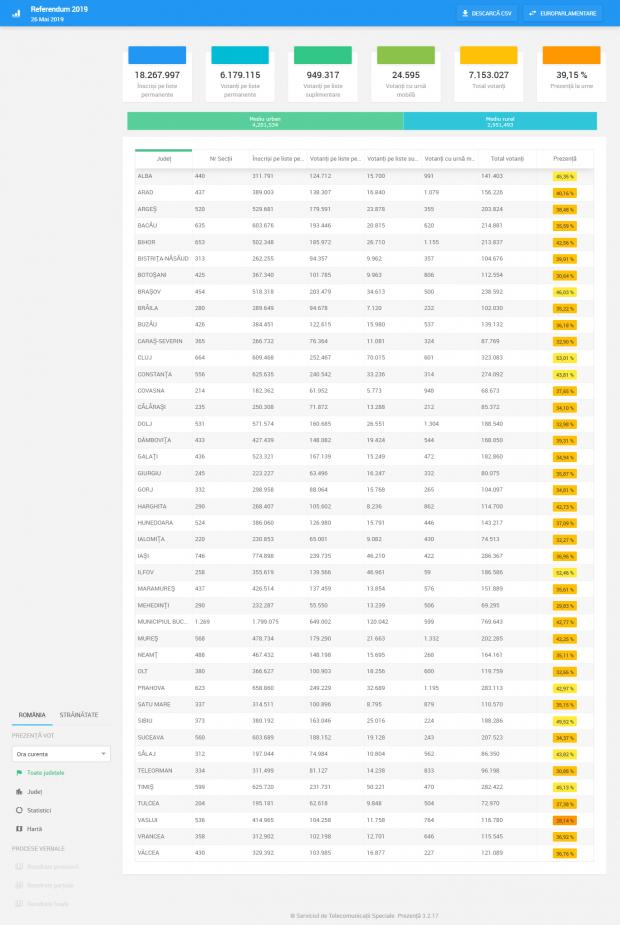 La ora 17.00, prezența la vot la alegerile europarlamentare era de 35.07%, iar la Referendum de 29.06%. Asta înseamnă că până la această oră votaseră 6.408.145 români , iar la Referendum, 5.309.513 români.