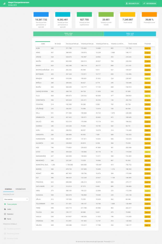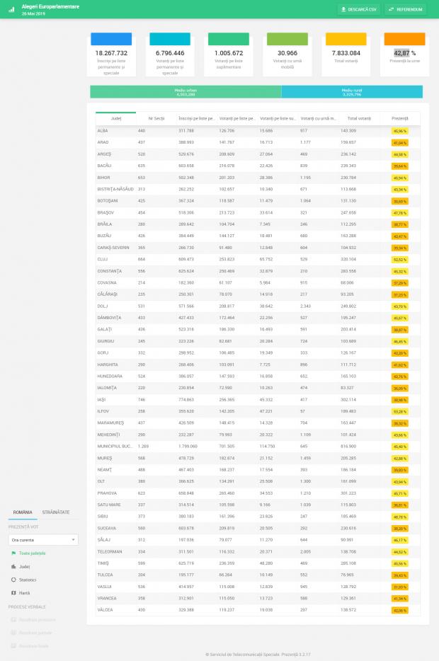 Total votanţi au fost 4.170.838, dintre care în mediul urban - 2.512.524 de alegători iar în mediul rural - 1.658.314.
