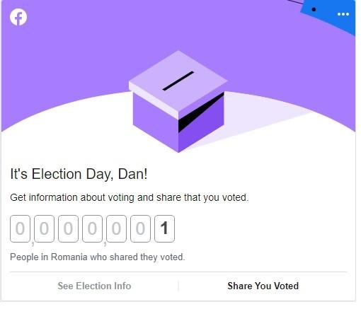 După deschiderea urnelor, la ora 7.00, Facebook le-a adresat un îndemn utilizatorilor. Românii care au mers la vot sunt încurajați să distribuie faptul că au votat deja, iar cei care nu au ajuns încă la urne sunt îndrumaţi către pagina oficială a Autorităţii Electorale Permanente, pentru mai multe informaţii despre alegeri.
