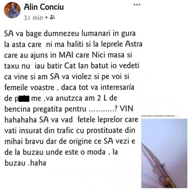 Amenințările sunt într-un limbaj suburban și sunt greu de reprodus ”SA va bage dumnezeu lumanari in gura la asta care ni ma haliti si la leprele Astra care au ajuns in MAI care Nici masa si nici taxu nu iau batir Cat Ian batut io vedeti ca vine si am SA va violez si pe voi si femeile voastre , daca tot va interesaria de p*** me, va anuntzca am 2 L de bencina pregatita pentru..............? VIN hahahaha SA va vad fetele leprelor vati insurat din trafic cu prostituate din mihai bravu dar de orgine ce SA vezi e de la buzau unde este o moda , la buzau .haha”