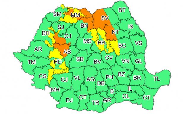 Din această noapte, de la ora 02:00, până luni, la ora 15:00, va fi cod galben de ninsori moderate și viscol. Local în Carpații Orientali și Occidentali, precum și în vestul Carpaților Meridionali vântul va avea intensificări, cu viteze de peste 70...80 km/h, temporar va fi viscol și vizibilitate scăzută. Local ninsorile vor fi moderate cantitativ.