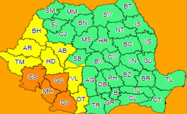 În intervalul 28 iulie ora 18:00 - 29 iulie ora 06:00 în judeţele Caraş-Severin, Mehedinţi, Gorj şi Dolj, vor fi perioade cu averse torenţiale, intensificãri puternice ale vântului cu rafale de peste 70-80 km/h, frecvente descãrcãri electrice şi grindinã.