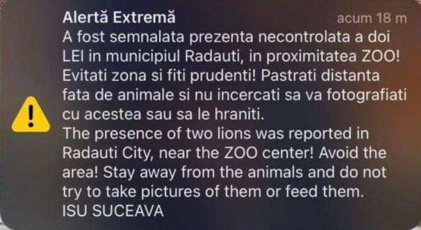 „A fost semnalată prezența necontrolată a doi lei în municipiul Rădăuți, în proximitatea Zoo. Evitați zona și fiți prudenți. Păstrați distanța față de animale și nu încercați să vă fotografiați cu acestea sau să le hrăniți”, este indicația dată de autorități prin mesajul de alertă.