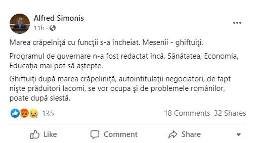 "Marea crăpelniţă cu funcţii s-a încheiat. Mesenii - ghiftuiţi. Programul de guvernare n-a fost redactat încă. Sănătatea, Economia, Educaţia mai pot să aştepte. Ghiftuiţi după marea crăpeliniţă, autointitulaţii negociatori, de fapt nişte prăduitori lacomi, se vor ocupa şi de problemele românilor, poate după siestă”, a scris Alfred Simonis, pe pagina sa de Facebook.