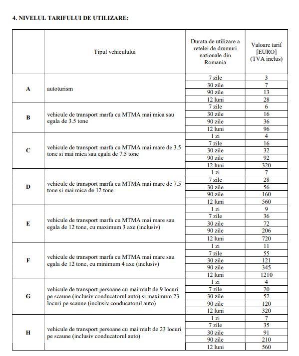 Atât pentru utilizatorii români cât și pentru utilizatorii străini, tariful de utilizare este structurat în funcție de durata de utilizare a rețelei de drumuri naționale din România, astfel: 1zi (cu excepția autoturismelor și a vehiculelor de transport marfă cu masa totală maximă autorizată mai mică sau egală cu 3,5 tone), 7 zile, 30 de zile, 90 de zile, 12 luni.