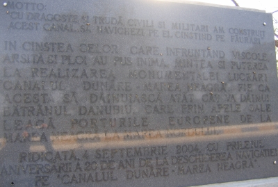 În cinstea celor care, înfruntând viscole, arşiţă şi ploi au pus inima, mintea şi puterea la realizarea monumentalei lucrări ?Canalul Dunăre ? Marea Neagră?. Fie ca acesta să dăinuiască atât cât va dăinui bătrânul Danubiu, care prin apele sale leagă porturile europene de la Marea Neagră la Marea Nordului.