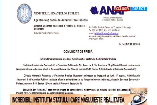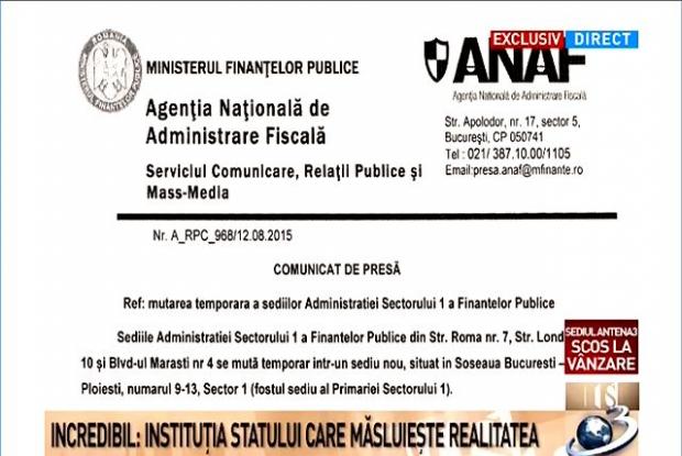 Comunicatul inițial al ANAF datează din 12 august 2015, atunci când instituția s-a mutat într-un sediu care era deja utilat, cel al fostei Primării a sectorului 1. În comunicatul de presă transmis, se spunea că mutarea se face în cinci zile.