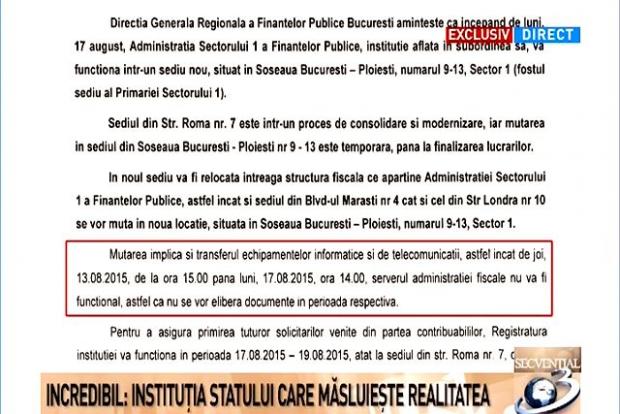 Astăzi, din comunicatul ANAF postat on-line ”s-a pierdut” un paragraf. Fix acela în care se vorbea de mutarea în cinci zile. ”În rest, comunicatul e identic”, a asigurat Adrian Ursu, moderatorul emisiunii Secvențial.