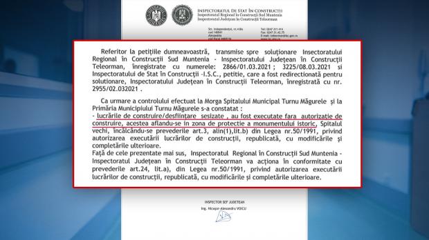 Un document obţinut de Antena 3 arată că lucrările de demolare a clădirii unde funcţionează morga au fost ordonate de director fără obţinerea autorizaţiei de demolare, Inspectoratul de Stat în Construcţii dispunând o anchetă şi, cel mai probabil, amendarea unităţii.