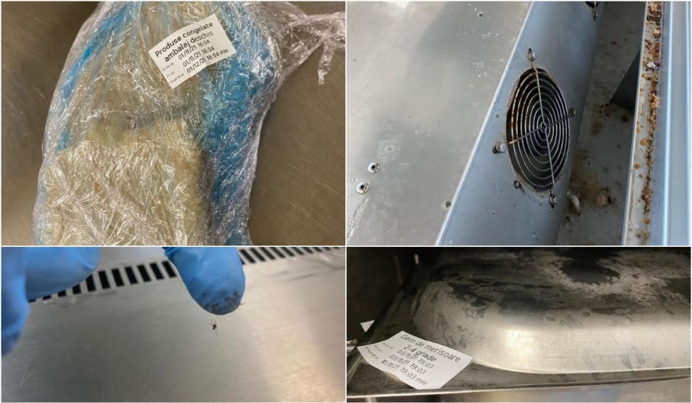 - utilizarea unor vitrine frigorifice care prezentau: zone cu rugină, mucegai, cu acumulări de apă, insecte moarte, resturi alimentare în strat grosier și praf la zona ventilatoarelor;