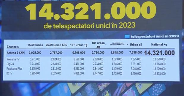 ”Dacă ne uităm pe target-ul considerat comercial, România activă, 25-59 urban, suntem numărul unu, cu 3.925.000 telespectatori unici. Pe publicul urban, de peste 18 ani, 6.708.000 de telespectatori. Publicul de peste 18 ani, considerat, de asemenea, cu putere mare de cumpărare, care are studii și așa mai departe, 2.796.000, tot numărul unu. Pe populația de peste 18 ani din mediul urban, cu studii superioare.
