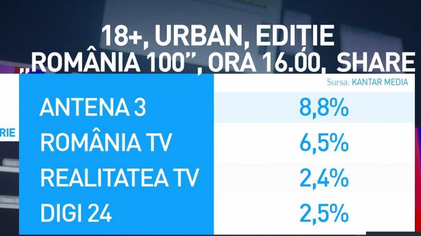 De la ora 19:00 până la ora 24:00, Antena 3 a dominat autoritar toate televiziunile de știri pe targetul 18+ Urban. În acest interval, începând cu ora 20:00, pe postul nostru a fost concursul maraton ”100 România”. Cea de-a treia ediție moderată de Mihai Gâdea și Adrian Ursu a înregistrat aproape 10% share pe publicul 18+ Urban.