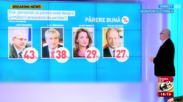''La Alina Gorghiu şi la Liviu Dragnea în mod evident partidele pe care le conduc tind să atingă scorul favorabilităţii pe care cei doi lideri o au. O uriaşă favorabilitate în raport cu scorul electoral al partidului pe care îl conduce o are Călin Popescu Tăriceanu. Şi Traian Băsescu se bucură de o favorabilitate relativ ridicată, e adevărat, şi cu un negativ îngrozitor de mare, dar care încă nu se vede în intenţia de vot a partidului respectiv'', a precizat sociologul Marius Pieleanu.