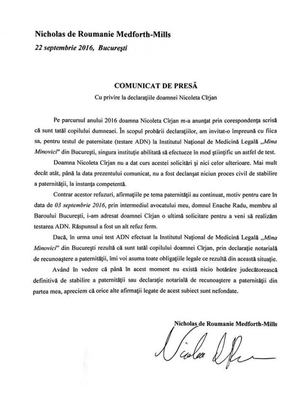"Doamna Nicoleta Cirjan nu a dat curs acestei solicitari și nici celor ulterioare. Mai mult decat atât, pănă la data prezentului comunicat, nu a declanșat niciun proces civil de stabilire a paternității, la instanța competentă", susține principele Nicholas de Roumanie Medforth-Mills.