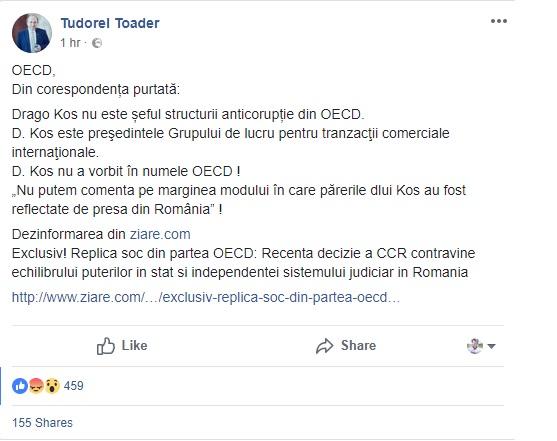 Toader a întrebat forul internaţional dacă declaraţiile au fost făcute în nume propriu sau în numele Organizaţiei. În răspunsul primit în scris, este precizat că Drago Kos nu este șeful structurii anticorupție din OECD, ci preşedintele Grupului de lucru pentru tranzacţii comerciale internaţionale.