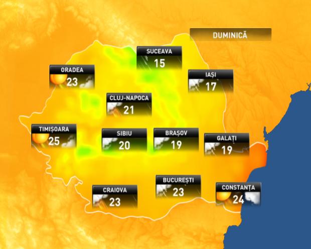 Vremea va fi rãcoroasã şi în general instabilã. Cerul va prezenta înnorãri temporar accentuate şi, îndeosebi în cursul zilei, vor fi averse, descãrcãri electrice şi intensificãri de scurtã duratã ale vântului în cea mai mare parte a ţãrii, exceptând vestul ţãrii, unde cerul va fi variabil şi astfel de fenomene se vor semnala cu totul izolat, mai ales la munte. În sud şi est, cantitãţile de apã vor fi mai însemnate. Temperaturile maxime se vor situa între 15 grade în nordul Moldovei şi 25 de grade în vest şi pe litoral. Temperaturile minime vor fi cuprinse între 9 grade în depresiuni şi 17 grade pe litoral.