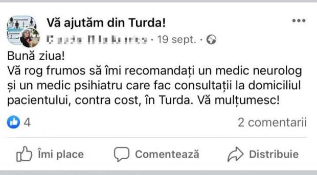 ”Vă rog frumos să îmi recomandați un medic neurolog și un medic psihiatru care fac consultații la domiciliul pacientului, contra cost, în Turda”, scria femeia pe Facebook pe data de 19 septembrie.