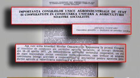 "Aşa cum arăta tovarăşul Nicolae Ceauşescu, în Cuvîntarea de la Plenară, aceste măsuri fac parte integrantă din politica agrară a partidului nostru în etapa de dezvoltare a societăţii noastre socialiste. Ele sunt menite să creeze un cadru organizatoric şi economic mai bun, în vederea înfăptuirii programului agrar elaborat de Congresul al XI-lea, să sporească rolul şi contribuţia agriculturii la făurirea societăţii socialiste multilateral dezvoltate în ţara noastră", scria, cât se poate de natural, Aspazia Cojocaru.