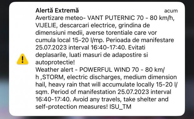 Locuitorii au fost avertizaţi şi prin mesaj Ro-Alert: