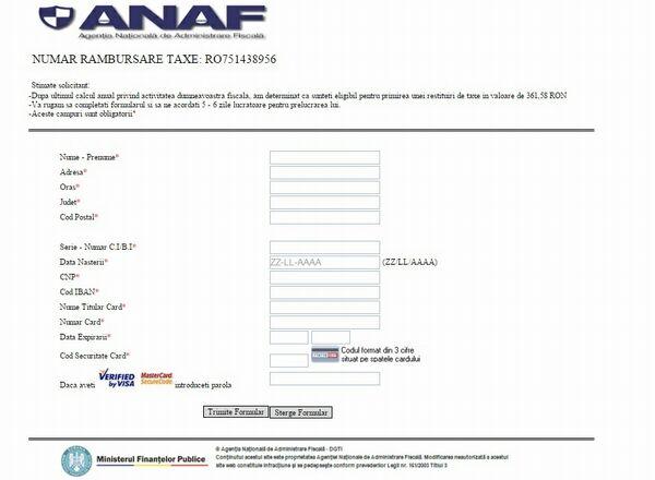 Agenția Națională de Administrare Fiscală (ANAF) avertizează contribuabilii cu privire la existența unui site, care nu aparține instituției, prin intermediul căruia contribuabililor li se cer date personale, inclusiv numărul cardului bancar, în vederea restituirii unei taxe, scrie
