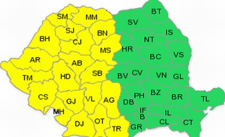 Astfel, în intervalul menţionat, în jumătatea de vest a ţării, vor fi averse cu caracter torenţial, intensificări ale vântului cu aspect de vijelie şi izolat caderi de grindina. Cantităţile de apă vor depăşi local 25l/mp şi punctiform 50 l/mp.