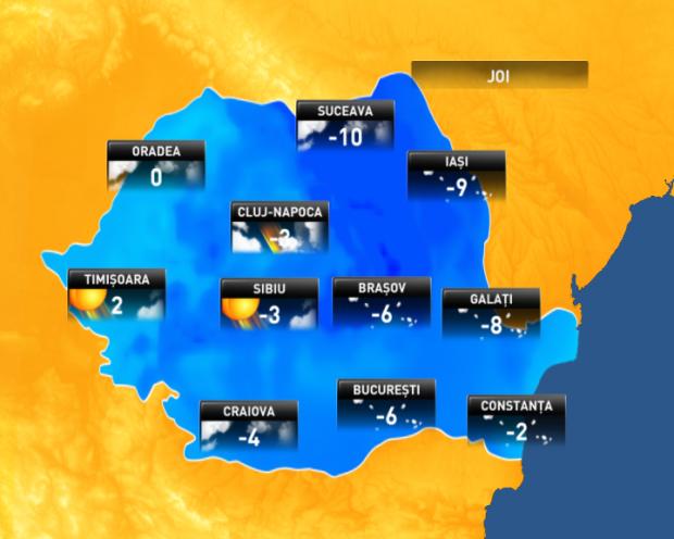 Vremea va fi rece, geroasã dimineaţa şi noaptea în special în estul şi centrul ţãrii. Cerul va fi mai mult noros în regiunile sudice şi estice şi temporar noros în restul teritoriului. Va ninge, îndeosebi în cursul zilei, local în Moldova, pe arii restrânse în Dobrogea şi Muntenia şi izolat în rest. Vântul va sufla în general moderat în sud-est şi va fi slab în restul zonelor. Temperaturile maxime vor fi cuprinse, în general, între -10 şi 0 grade, iar cele minime între -14 şi -4 grade, uşor mai coborâte în estul Transilvaniei. În zonele joase se va semnala ceaţã şi chiciurã Presiunea atmosferica nu se va modifica semnificativ.