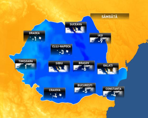 Vremea va fi rece în majoritatea zonelor ţãrii, geroasã în Moldova şi local în Transilvania şi Muntenia. În Dobrogea, în sudul şi estul Munteniei şi în sudul Moldovei vântul va avea intensificãri susţinute, cu rafale ce vor depãşi 60...70 km/h. În aceste zone va ninge, iar în judeţele Constanţa, Tulcea, Giurgiu, Ialomiţa şi Cãlãraşi va fi viscol şi vizibilitate redusã. În restul teritoriului vântul va fi slab pânã la moderat, doar izolat va ninge slab şi pe arii restrânse va fi ceaţã. Temperaturile minime se vor încadra între -14 şi -4 grade, mai coborâte în depresiuni, pânã în jur de -20 de grade, dar şi mai ridicate în vest.