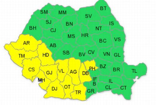 În intervalul menţionat, in Banat, Oltenia, vestul Munteniei şi Carpaţii Meridionali vor fi averse, descărcări electrice, intensificări ale vântului ce vor lua şi aspect de vijelie şi izolat căderi de grindină.