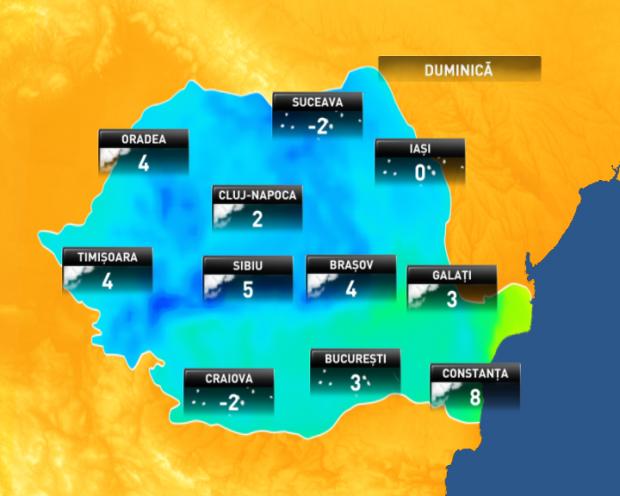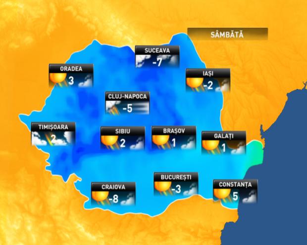 Deşi valorile termice vor creşte mai ales în vestul ţãrii, vremea va fi rece pentru aceastã datã cu deosebire în centru, nord-est şi sud. Ziua, cerul va fi variabil, dar începând cu orele serii se va înnora treptat în toate zonele. În cursul nopţii se vor semnala precipitaţii pe arii extinse în vestul, centrul şi nordul teritoriului, local în zona deluroasã din sud şi est, iar izolat şi în rest. Acestea vor fi predominant sub formã de ploaie şi lapoviţã în Banat, Crişana, Maramureş, vestul Transilvaniei şi pe arii restrânse în Oltenia, zone unde vor fi condiţii de polei şi sub formã de ninsoare în celelalte regiuni. Vântul va prezenta intensificãri în Banat, Crişana şi local în Transilvania, Moldova şi la munte, cu viteze ce vor atinge la rafalã 55...60 km/h şi pe arii restrânse va viscoli sau spulbera zãpada depusã în zilele precedente. Temperaturile maxime vor avea valori de la -10 grade în Oltenia şi estul Transilvaniei pânã la 7 grade în Dealurile de Vest, iar temperaturile minime se vor situa între -10 şi 0 grade, mai ridicate pânã spre 3 grade în regiunile vestice. În zonele joase, se va semnala ceaţã şi chiciurã. Presiunea atmosferica va fi în scãdere.