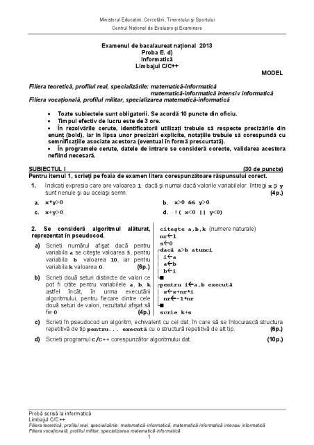 Candidații vor avea de rezolvat trei subiecte, fiecare notat cu câte 30 de puncte, iar 10 puncte se vor acorda din oficiu.